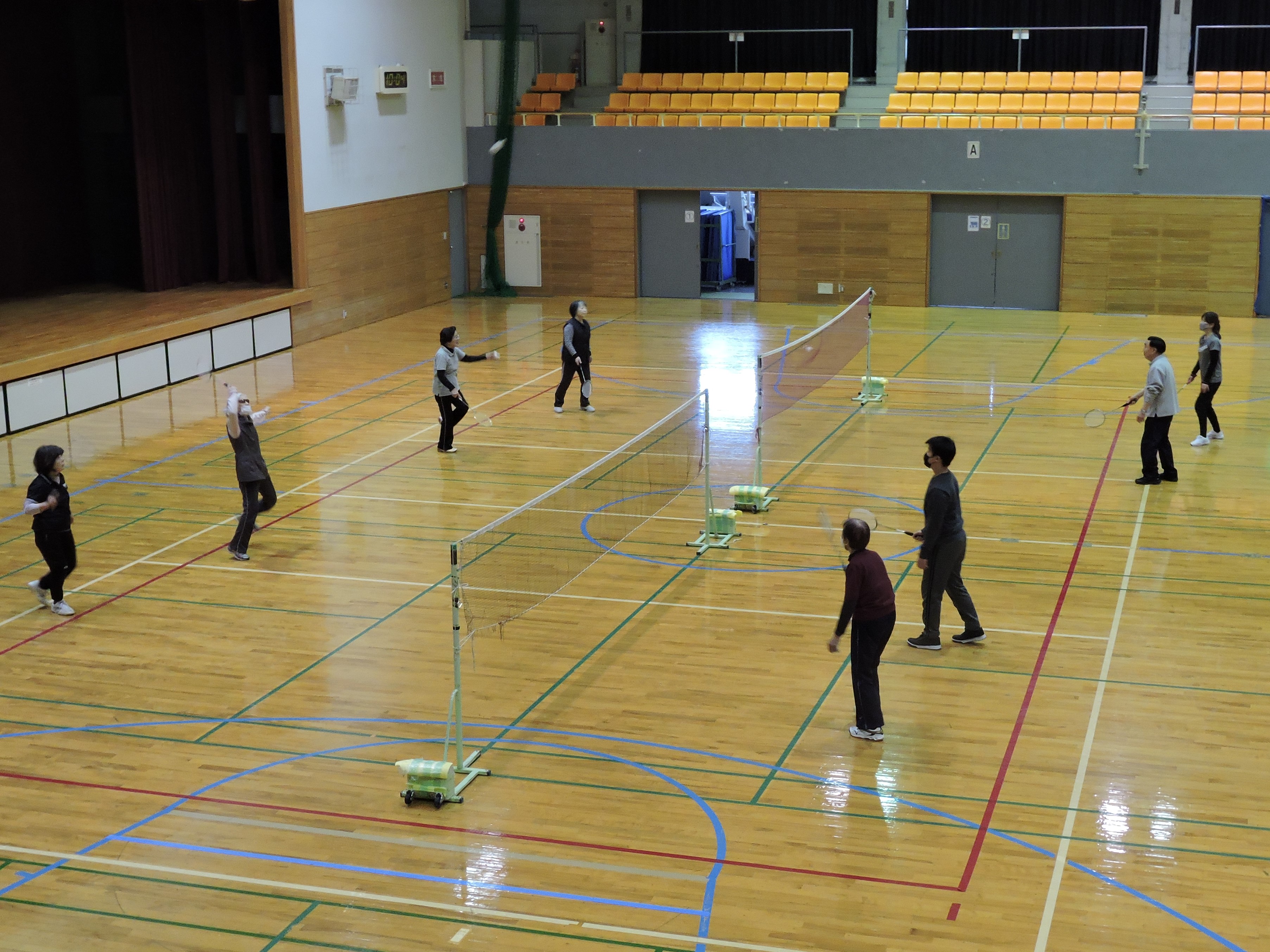 約10名で活動しています。前半はバドミントン・卓球を実施し、ティータイムを設けて談笑、その後じゃんけんでチーム分けをして、ソフトバレーボールの試合をしています。
